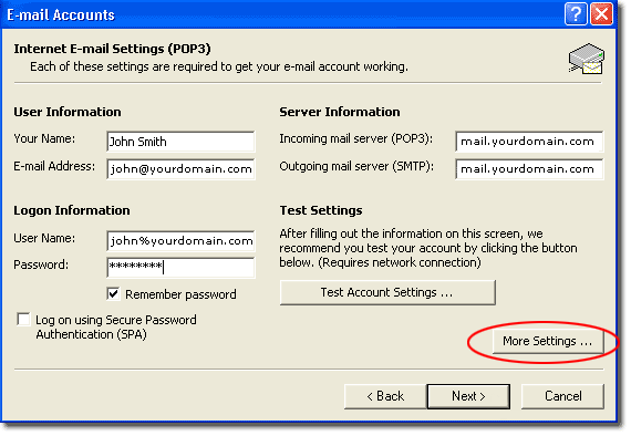 Setting up SMTP Authentication for Microsoft Outlook 2002If your ISP does not provide SMTP server service for your use, you may use the Dollarhost mail server for SMTP. You will have to specify your Outlook 2002 software to authenticate in order for the SMTP server to accept your outgoing email. On your Outlook 2002 Internet E-mail Settings (POP3) page, enter mail.yourdomain.com as your Outgoing mail server (SMTP) and then click More Settings....